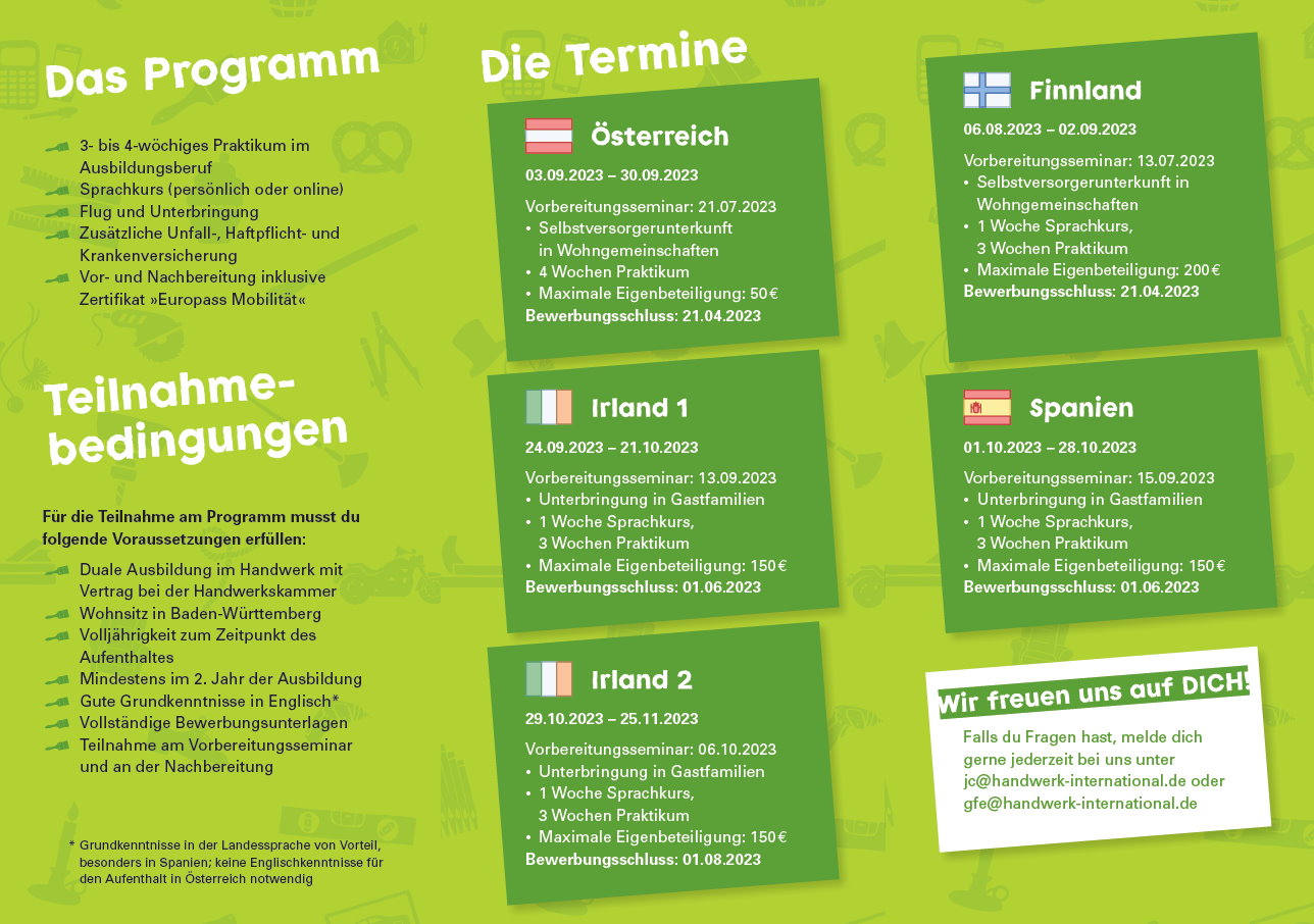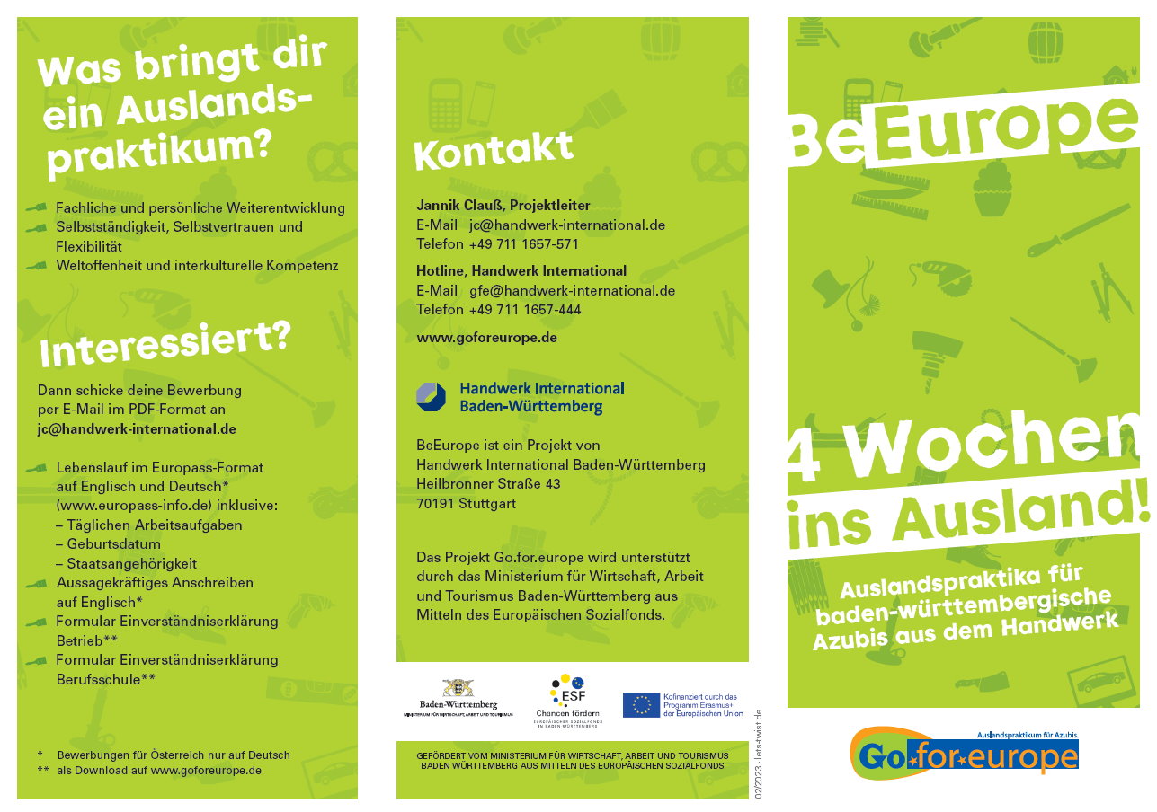 Steigerung der Attraktivität der Ausbildung Neue Ideen und Arbeitsmethoden frisch aus der Auslandspraxis Flexibilität und Mobilität von angehenden Fachkräften Für das zweite Halbjahr 2023 bietet sich für Auszubildende wieder die Möglichkeit, ein vierwöchiges Auslandspraktikum über BeEurope zu absolvieren. Details zu den Gruppenterminen können Sie dem angehängten Flyer entnehmen.