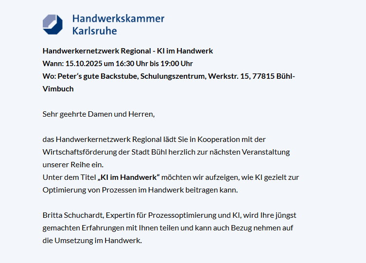 Das Handwerkernetzwerk Regional lädt am 15. Oktober 2025 zu einer spannenden Veranstaltung zum Thema Künstliche Intelligenz im Handwerk ein.